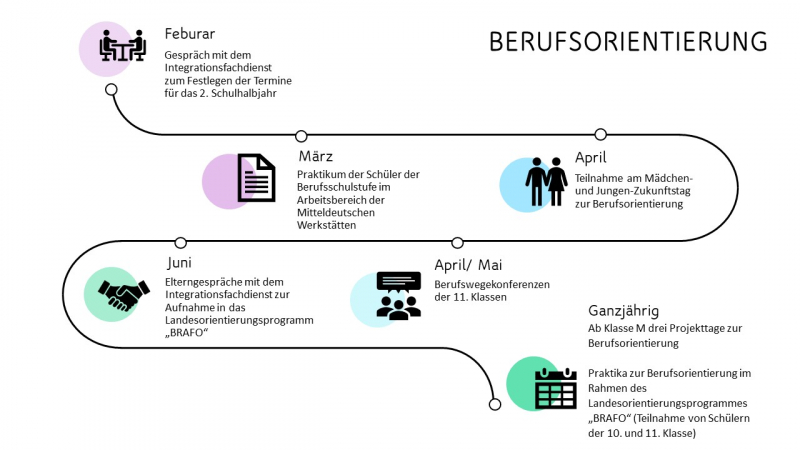 regelmäßige Praxistage innerhalb der Schule (Tätigkeitsbereiche: Wäschepflege, Büro, gartenbau, Landschaftspflege, Haustechnik, Computer, Ernährung, Hauswirtschaft) Teilnahme am BRAFO-Projekt Teilnahme am Zukunftstag jährliche Schülerpraktika (vorrangig in umliegenden Werkstätten für Menschen mit Behinderung--> weitere Informationen hier)