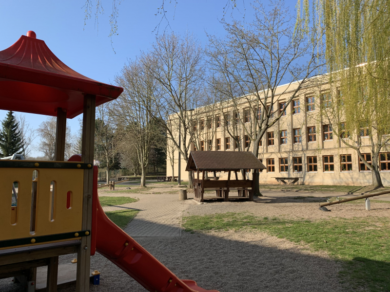Der untere Schulhof verfügt über einen großen Spielplatz, auf dem ausreichend Spielgeräte und Sitzgelegenheiten zur Verfügung stehen.